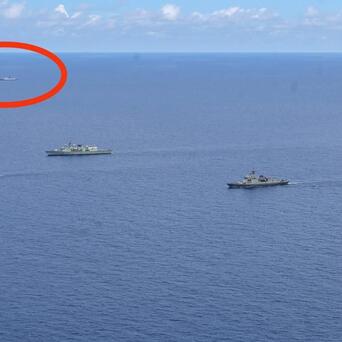 报道称,当时,以美国为首的联合舰队共4艘船,正在以菱形队形在所谓“菲律宾专属经济区”航行,三艘解放军军舰出现在目视范围内,“包围”了联合舰队。船员们只能小心地操纵船只,与中国军舰保持距离,但解放军军舰始终在联合舰队的水兵们的视线内,监控着军演动向,在加拿大的“蒙特利尔“”号护卫舰起飞直升机时,解放军也针锋相对地起飞了一架直升机。